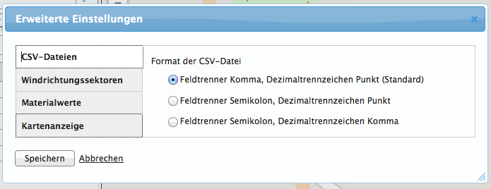 Nach dem Hochladen der Eingabedateien kann in einem neuen Dialog "Erweiterte Einstellungen" eingestellt werden, in welchem CSV-Format die Ergebnisdateien zum Download bereit gestellt werden sollen. Das Dateiformat wird durch den Feldtrennzeichen (Komma oder Semikolon) und das Dezimaltrennzeichen (Komma oder Punkt) bestimmt. Voreingestellt wird das Dateiformat genutzt, welches beim Einlesen des Inputfiles ermittelt wurde. Mit dieser erweiterten Einstellmöglichkeit können Eingabedateien in einem fremden CSV-Dateiformat verarbeitet und im eigenen Format zur Auswertung heruntergeladen werden.